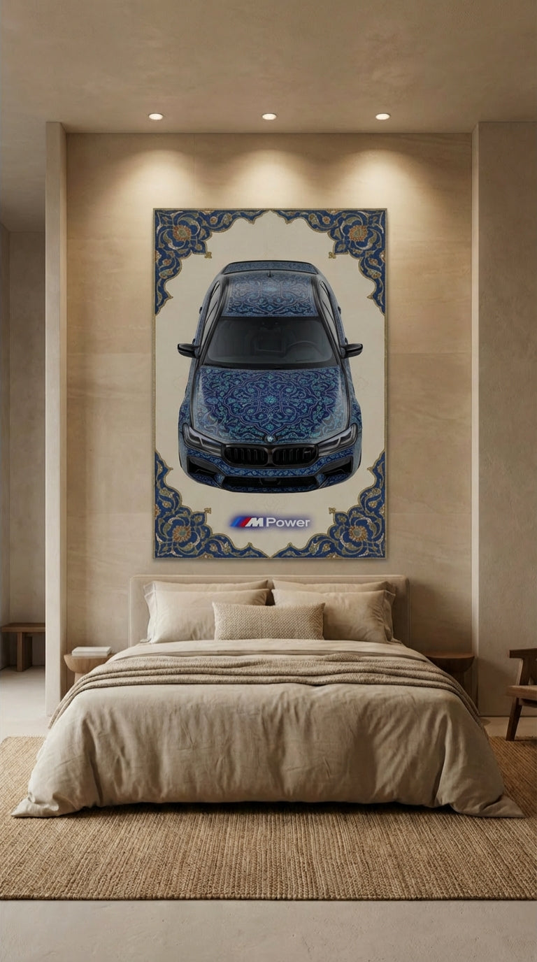 Inspired by the M5's perfect balance between luxury and raw performance, this design translates high-speed engineering into visual discipline. Deep blue arabesque geometry flows across the surface with symmetry and force, reflecting torque, precision, and authority at speed.