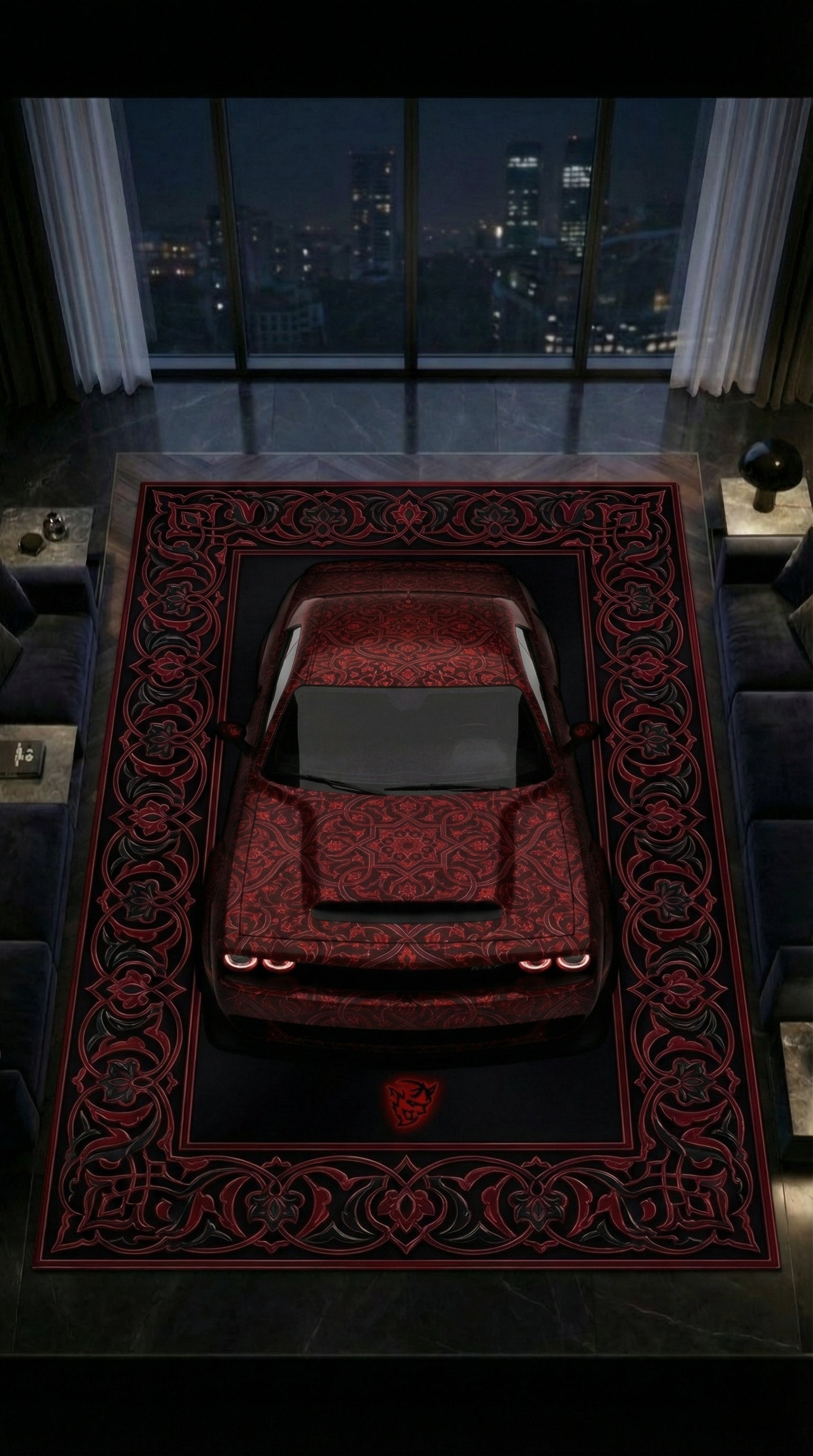 Inspired by the Demon's extreme power and drag-strip DNA, this design fuses brutal performance with dark ornamental detailing. The red-on-black arabesque pattern amplifies the car's violent character, turning horsepower into visual intimidation.