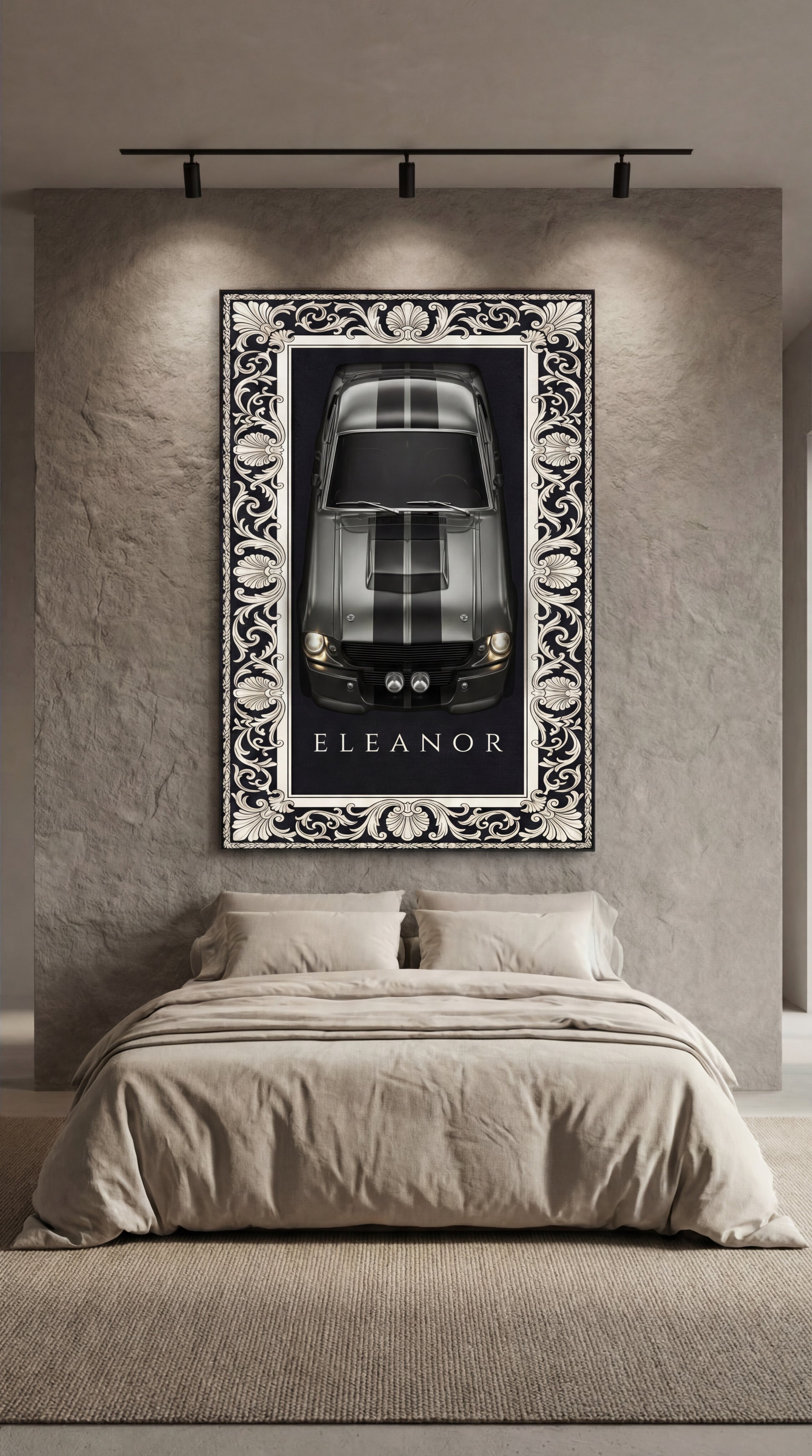 Inspired by the Eleanor Mustang's unmistakable silhouette, this design blends classic racing stripes with refined ornamental framing. The composition balances restraint and menace, capturing the quiet confidence of a machine that doesn't need to prove itself. Every line feels deliberate, every contrast controlled.
